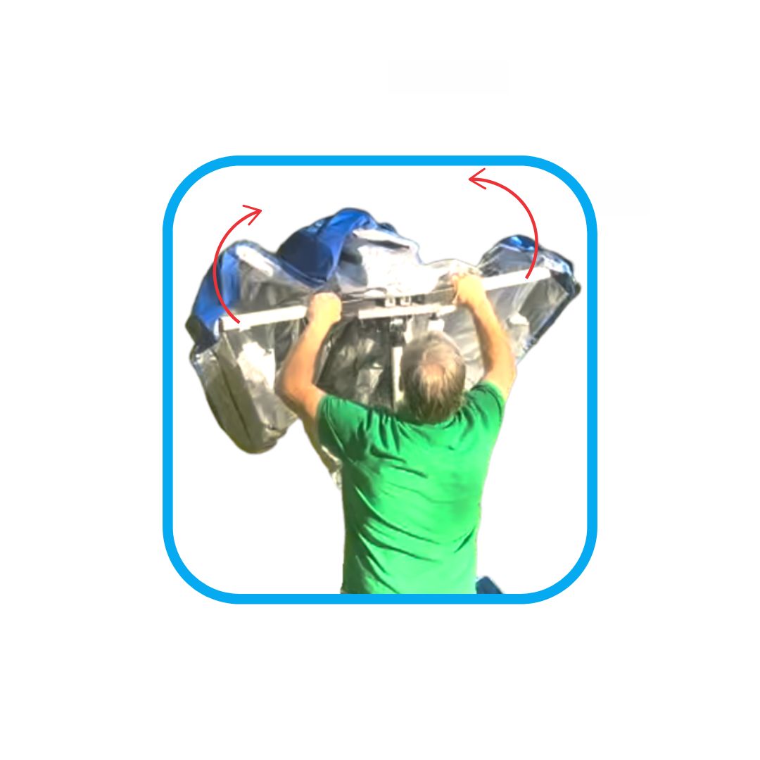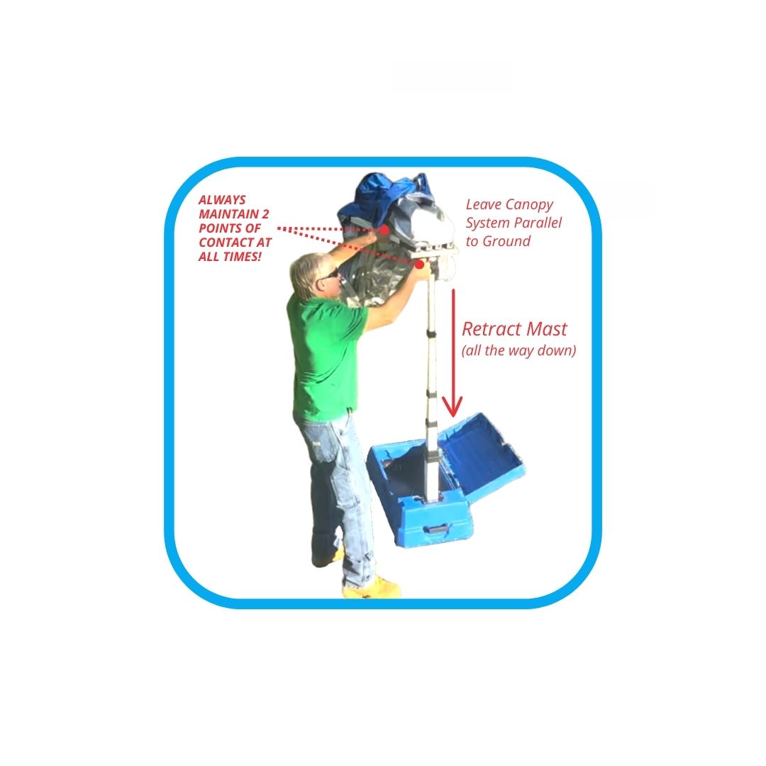 Leave the canopy system parallel to the ground & retract the mast all the way down until it stops by holding the system with one hand and holding the mast plunger with the other hand.
