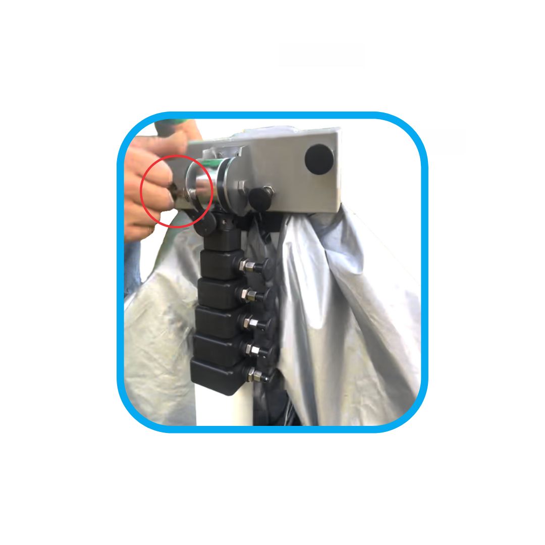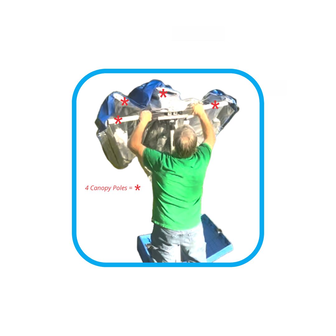 Make sure to secure the mast back to ‘head level’ position. Once at head level, push the buttons on the canopy poles to retract all four of the canopy poles one by one until all are fully retracted.