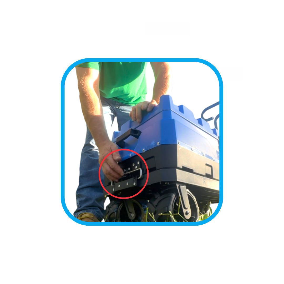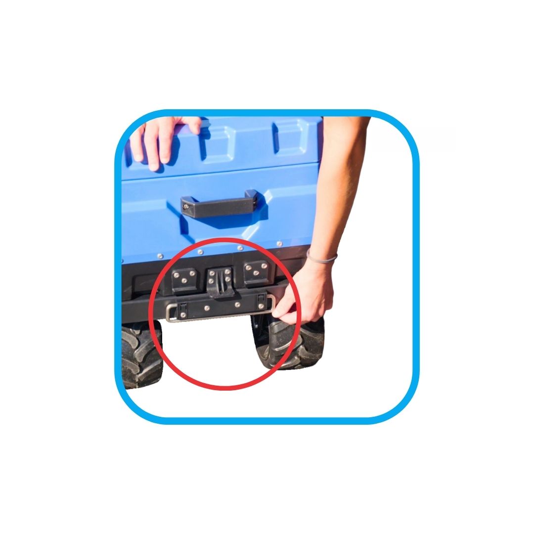 Place the box unit back on top of the wheel platform. Once you have the box of the unit positioned on the cart, insert the locating tab on the front of the wagon & then, latch the hinge at the rear of TheShadeWagon (see hinge circled in red).