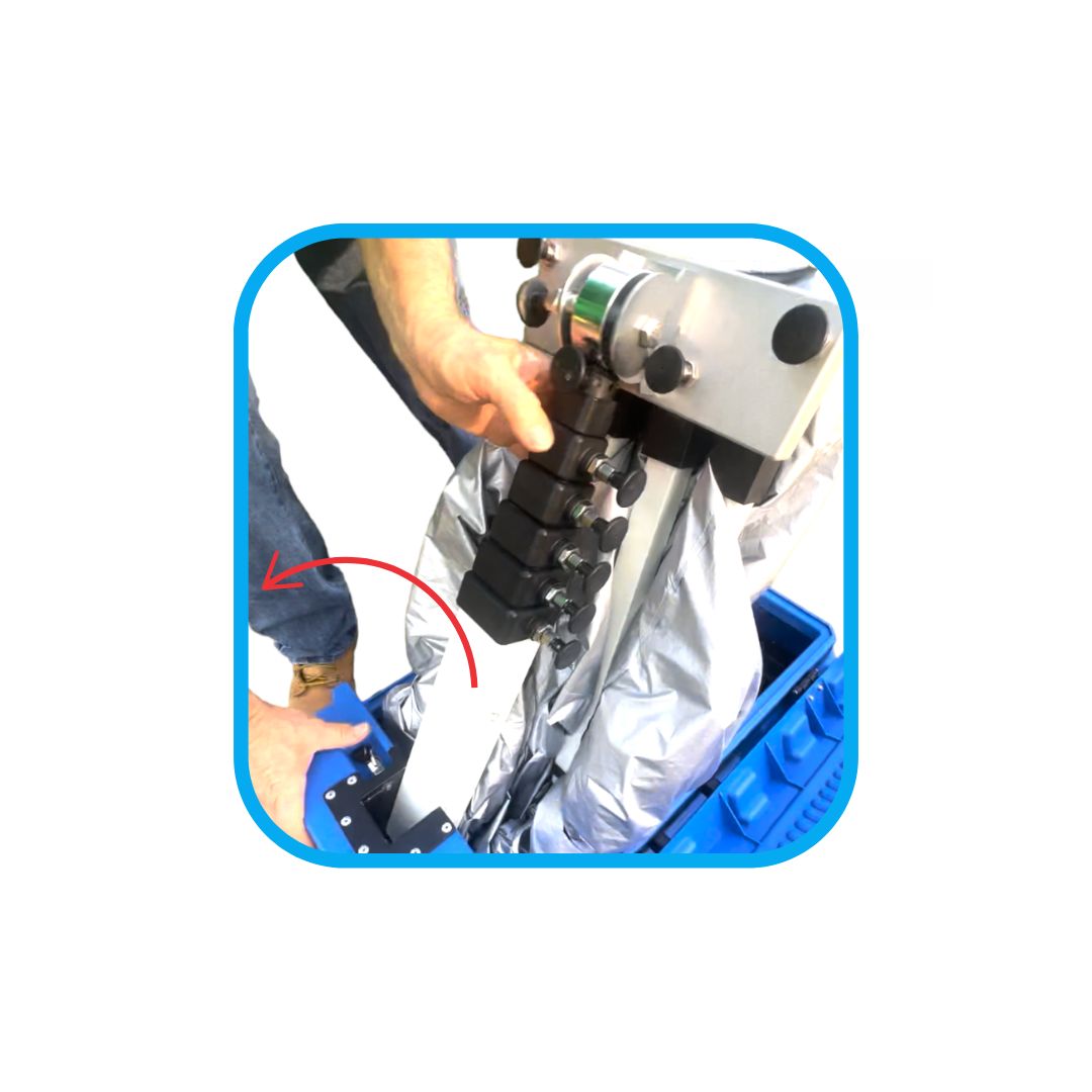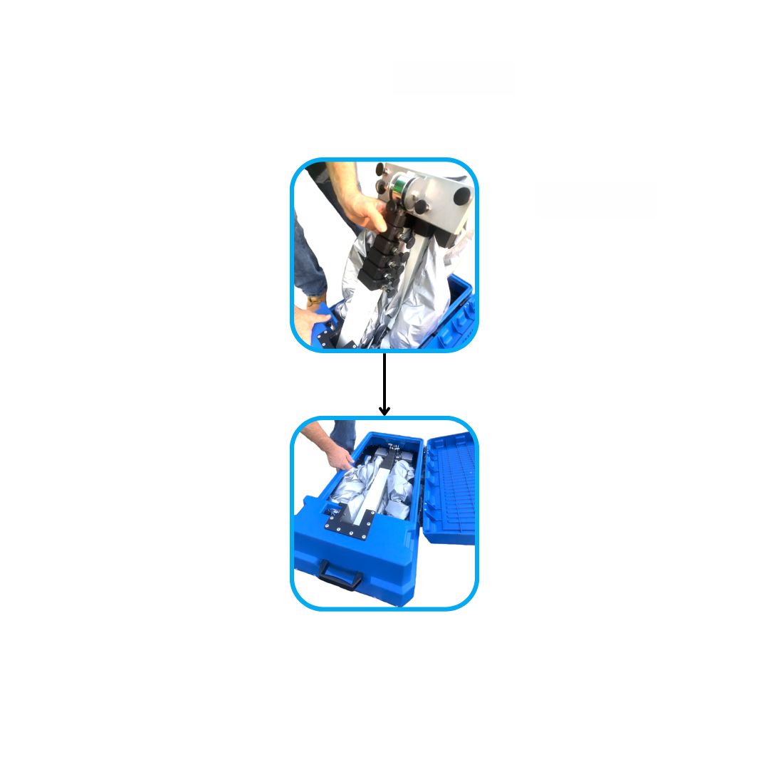 After the canopy system is pointed downward, parallel to the mast, pull the mast locking ring at the base of the mast, carefully laying the entire system inside of the box unit (maintaining two points of contact). Then, you may close the lid.