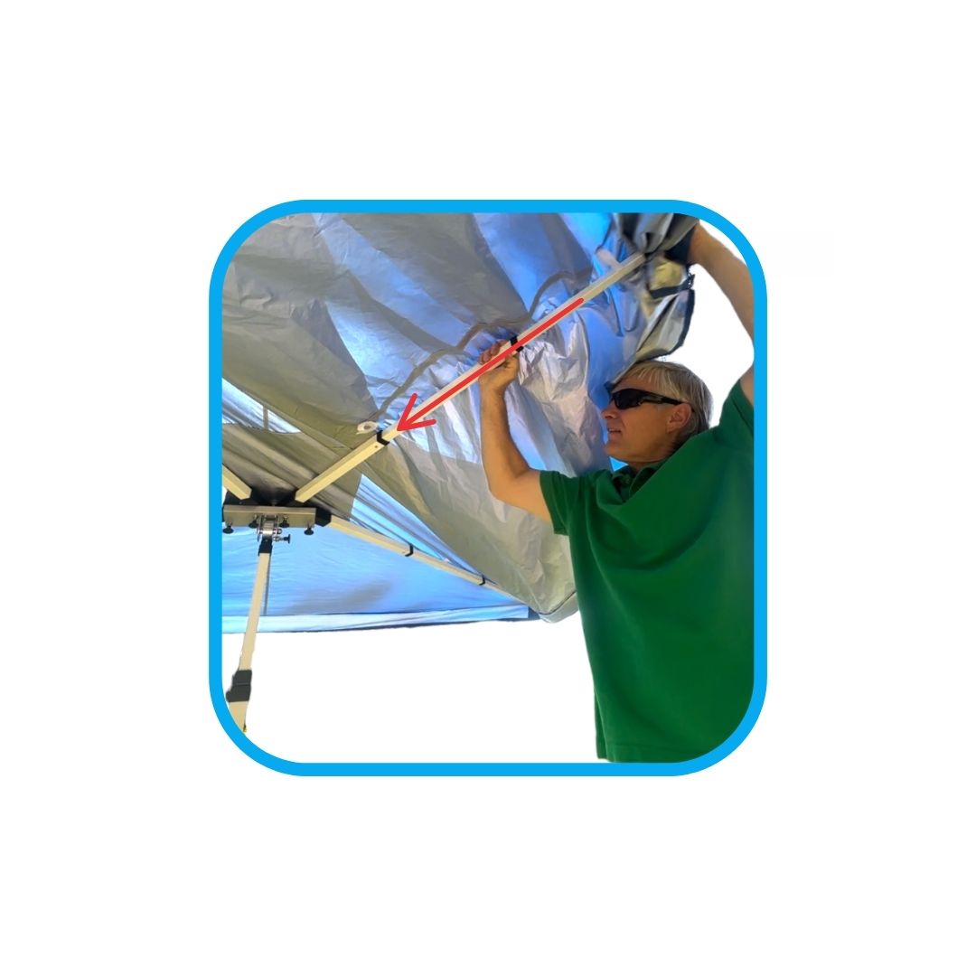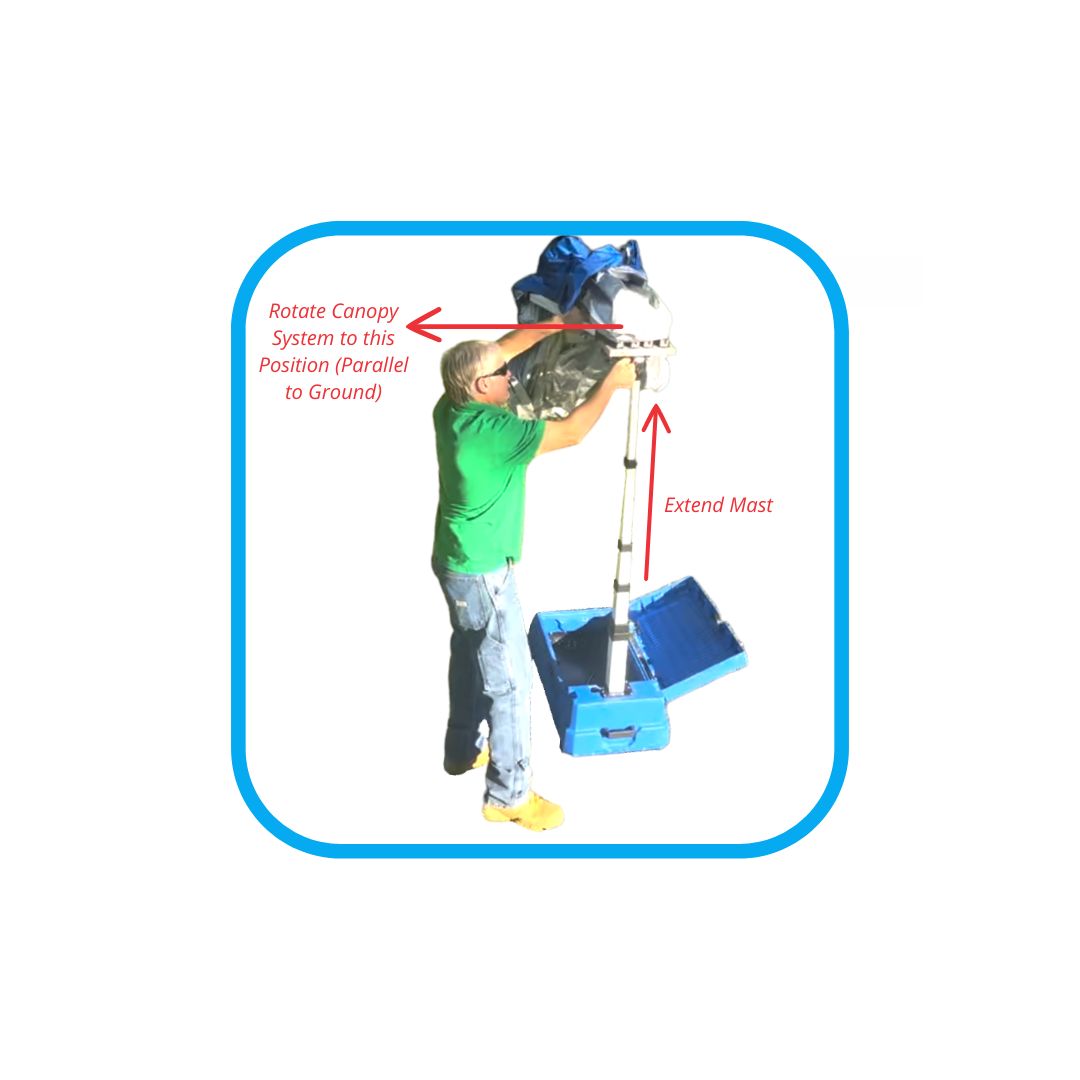 Extend the mast system upward until it is just above your head. With the mast placed just above head level, rotate the canopy pole system upward until they are parallel to the ground.