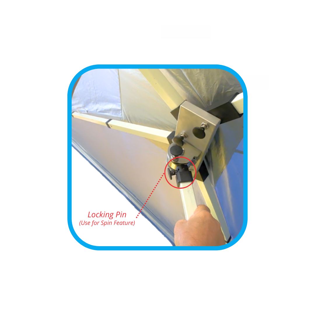 To use the 360° spin mechanism, pull the locking pin located at the top center of the mast (circled in red on the image pictured to your left), unlocking the canopy. Once you have found your desired position, re-insert the locking pin back into the mast.